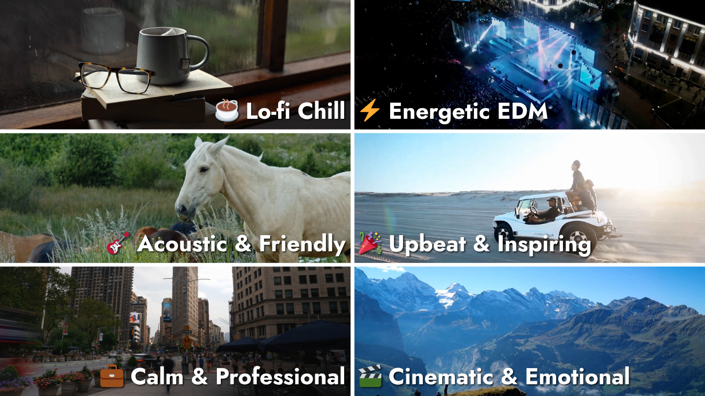 Generate a custom, copyright-free music track and have it automatically fit your MP4 video. Choose a style, preview the result, adjust volume or fades, and export when ready.